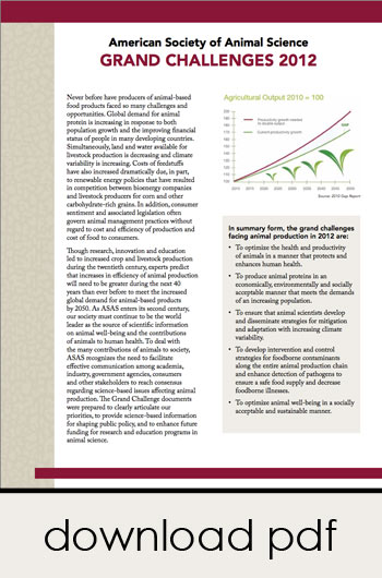 The Grand Challenges documents are ASAS endorsed and advocated research priorities for the future of animal science. With the support of policy makers and the public, animal scientists can continue to feed the world. To read the documents, go to: http://asas.org/public-policy/asas-grand-challenges